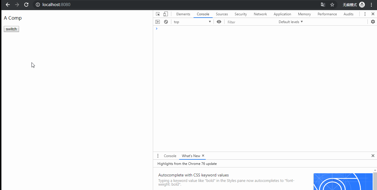 在上述代码中,我们定义了两个组件A和B并为其绑定了钩子函数,并且在根组件中用 <keep-alive>组件包裹了一个动态组件,这个动态组件默认指向组件A,当点击switch按钮时,动态切换组件A和B。我们来看下效果:
