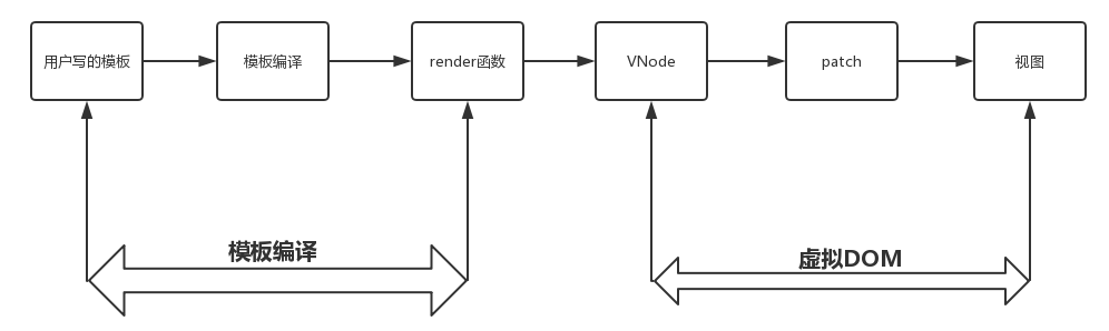 所谓渲染流程,就是把用户写的类似于原生HTML的模板经过一系列处理最终反应到视图中称之为整个渲染流程。这个流程在上文中其实已经说到了,下面我们以流程图的形式宏观的了解一下,流程图如下: