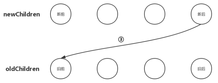 把newChildren数组里所有未处理子节点的最后一个子节点和oldChildren数组里所有未处理子节点的第一个子节点做比对,如果相同,那就直接进入更新节点的操作,更新完后再将oldChildren数组里的该节点移动到与newChildren数组里节点相同的位置;