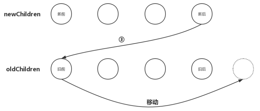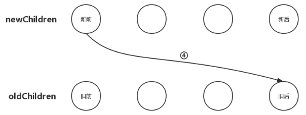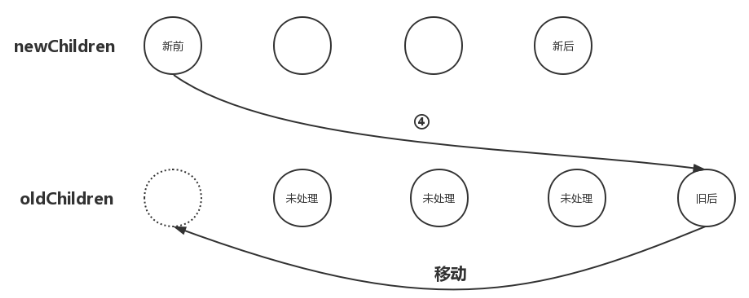 同样,这种情况的节点移动位置逻辑与“新后与旧前”的逻辑类似,那就是newChildren数组里的第一个子节点与oldChildren数组里的最后一个子节点相同,那么我们就应该在oldChildren数组里把最后一个子节点移动到第一个子节点的位置,如下图: