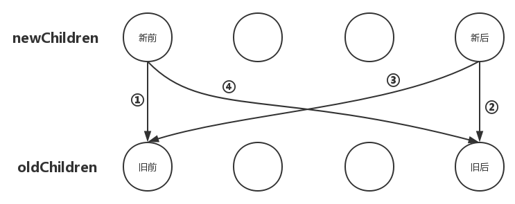 newChildren数组里的所有未处理子节点的第一个子节点称为:新前;newChildren数组里的所有未处理子节点的最后一个子节点称为:新后;oldChildren数组里的所有未处理子节点的第一个子节点称为:旧前;oldChildren数组里的所有未处理子节点的最后一个子节点称为:旧后;