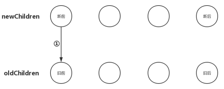 把newChildren数组里的所有未处理子节点的第一个子节点和oldChildren数组里所有未处理子节点的第一个子节点做比对,如果相同,那好极了,直接进入之前文章中说的更新节点的操作并且由于新前与旧前两个节点的位置也相同,无需进行节点移动操作;如果不同,没关系,再尝试后面三种情况。