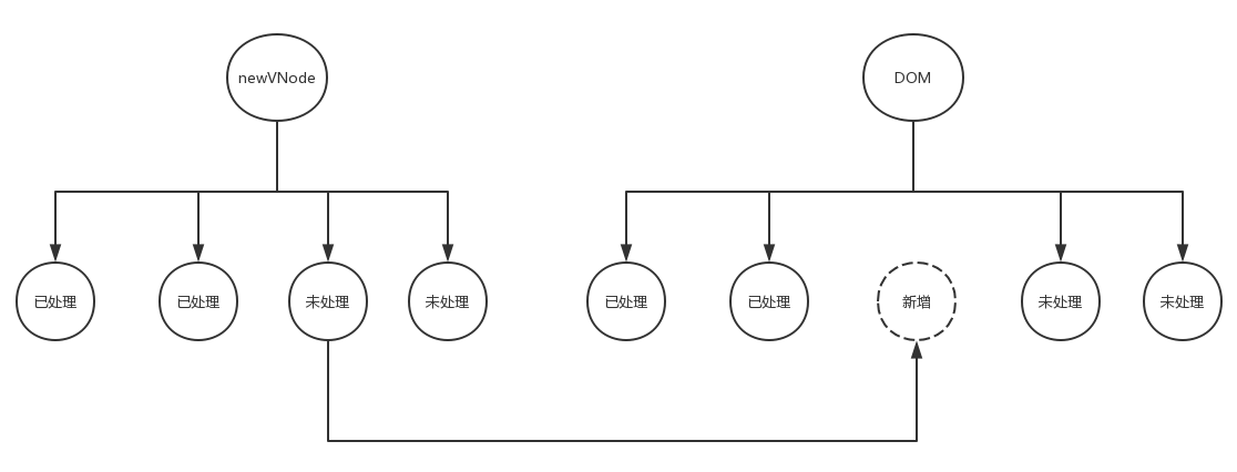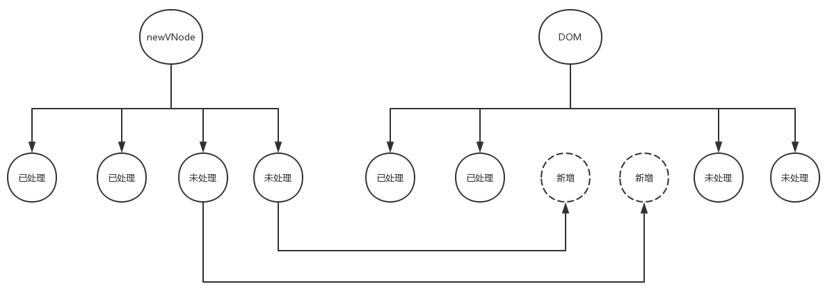 如果把newChildren里面的每一个子节点都循环一遍,能在oldChildren数组里找到的就处理它,找不到的就新增,直到把newChildren里面所有子节点都过一遍后,发现在oldChildren还存在未处理的子节点,那就说明这些未处理的子节点是需要被废弃的,那么就将这些节点删除。
