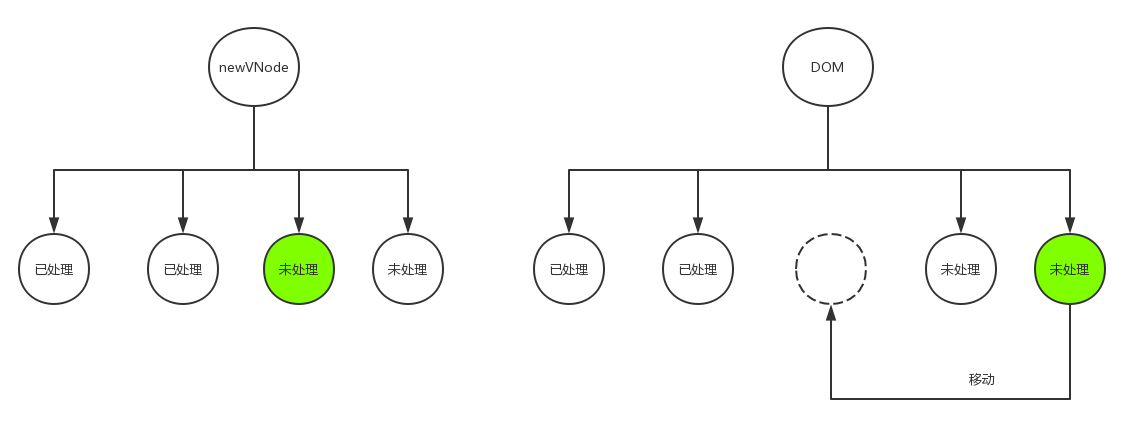 在上图中,绿色的两个节点是相同节点但是所处位置不同,即newChildren里面的第三个子节点与真实DOM即oldChildren里面的第四个子节点相同但是所处位置不同,按照上面所说的,我们应该以newChildren里子节点的位置为基准,调整oldChildren里该节点的位置,所以我们应该把真实DOM即oldChildren里面的第四个节点移动到第三个节点的位置,通过上图中的标注我们不难发现,所有未处理节点之前就是我们要移动的目的位置。如果此时你说那可不可以移动到所有已处理节点之后呢?那就又回到了更新节点时所遇到的那个问题了:如果前面有新增的节点呢?